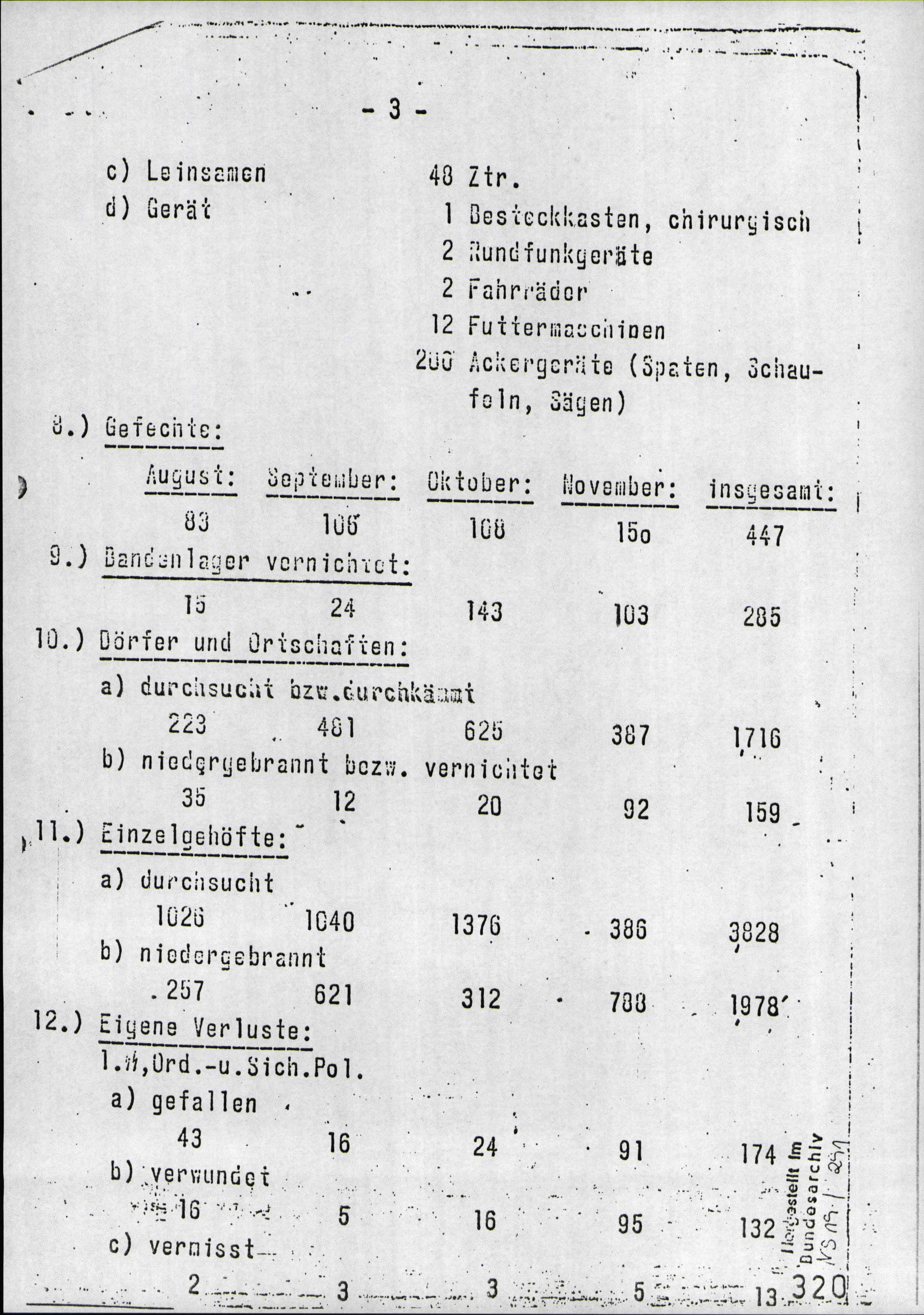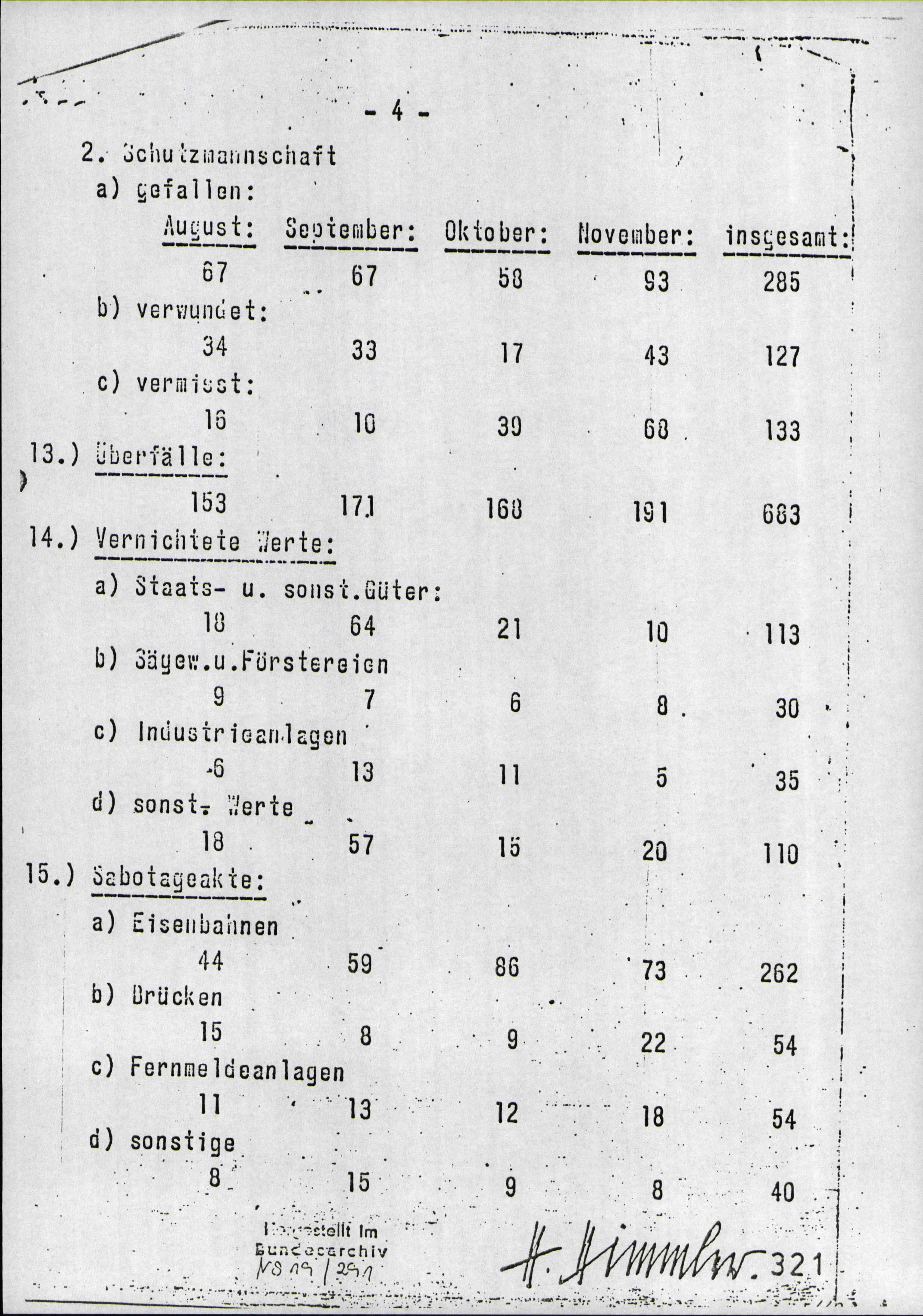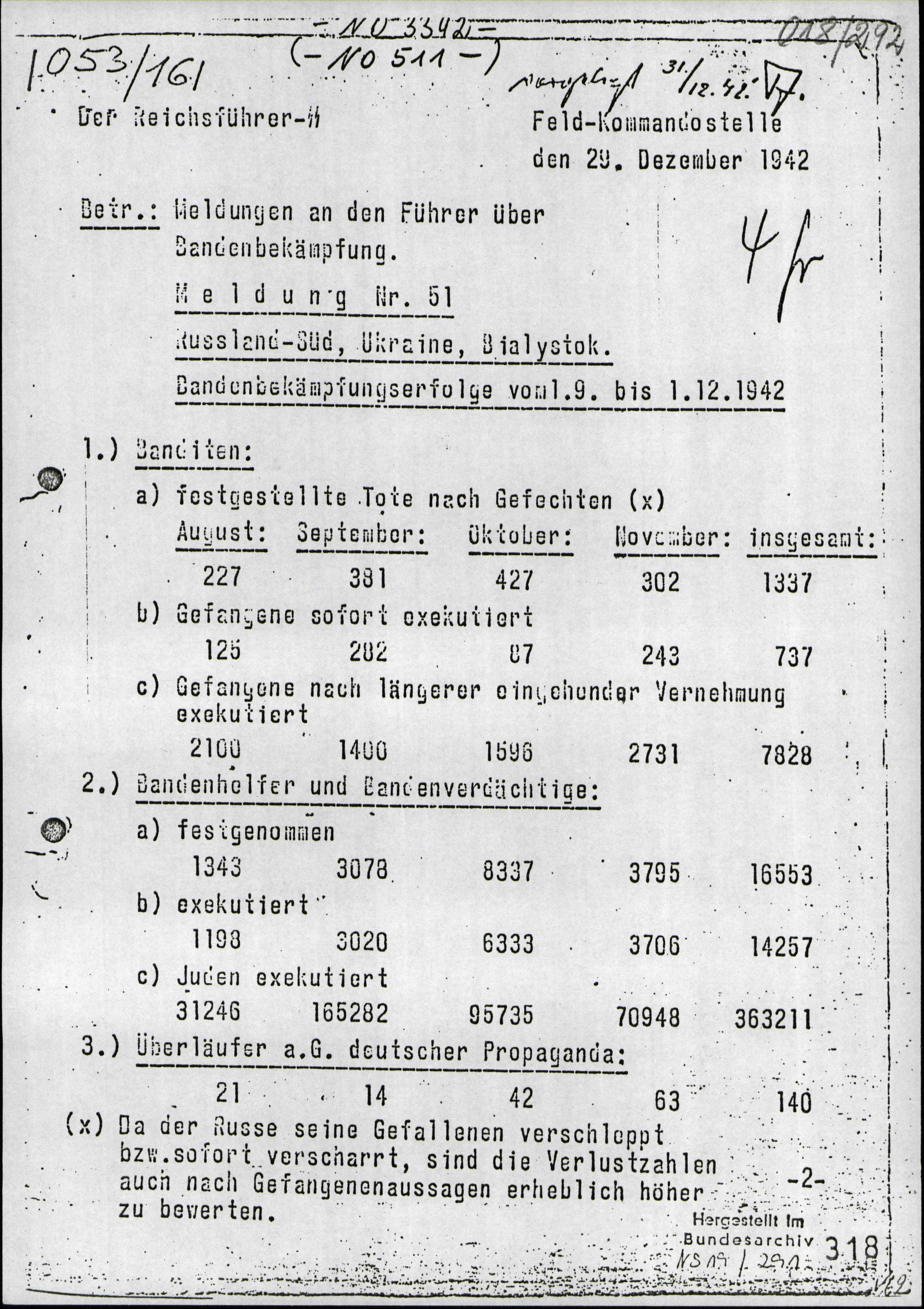 This is a report from Heinrich Himmler to Hitler on the combatting of partisans in the Ukraine area. Many people will feel the need to point out the fact that the 363211 Jews executed are listed under the "Gang Helpers and Gang Suspects" (in this case, "gang" refers to partisan" section. This is true, but that doesn't mean those Jews were legitimately bandit helpers or in any way complicit with partisans. However, as shown by the analysis of the report done by Hanz Metzner, the population of the areas which saw around 85% of these killings was about 326,000, so the overwhelming majority of these Jews - many of whom were women and children - would have had to be helping partisans. That is, however, unlikely due to the fact that, as an armament inspector in Ukraine put it,